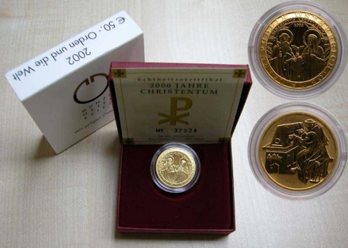 50 евро 2002 года "2000 лет Христианства, Орден и Мир", 10 гр.