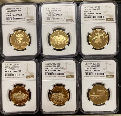 Набор золотых монет 100 рублей " Олимпиада 1980г. " в слабах NGC PROOF 70 ULTRA CAMEO