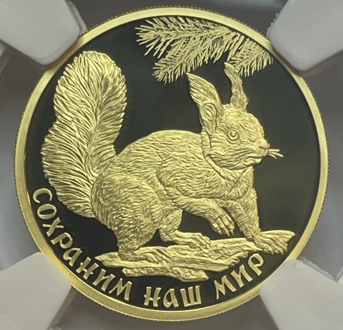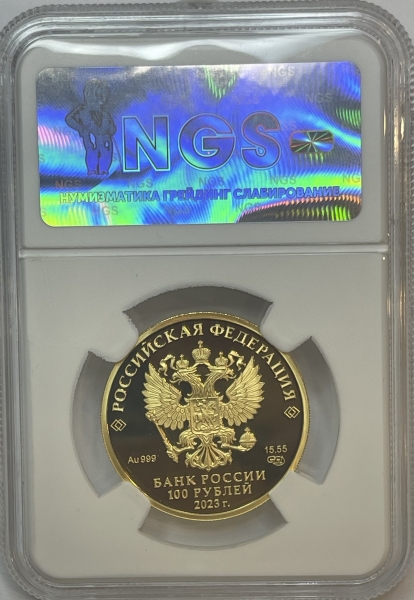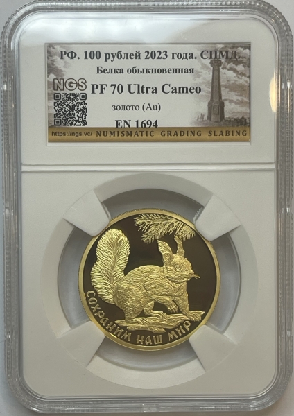 Золотая монета 100 рублей Белка в слабе Proof 70 ,2023 г.,