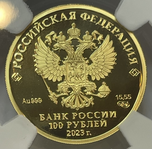 По центру изображен Государственный герб Российской Федерации, сверху вдоль канта – название страны «РОССИЙСКАЯ ФЕДЕРАЦИЯ», обрамленное с обеих сторон сдвоенными ромбами. Снизу горизонтально надпись в три строки – «БАНК РОССИИ, 100 РУБЛЕЙ, 2023 г.». Под гербом: слева – обозначения драгоценного металла и пробы сплава «Au999», справа – содержание химически чистого металла и товарный знак монетного двора «15,55 СПМД».