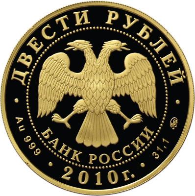 Аверс: в центре - эмблема Банка России (двуглавый орёл с опущенными крыльями, под ним - надпись полукругом "БАНК РОССИИ"), обрамленная кругом из точек и надписями по кругу - вверху: "ДВЕСТИ РУБЛЕЙ", внизу: слева - обозначения драгоценного металла и пробы сплава, в центре - дата выпуска "2010 г.", справа - содержание химически чистого металла и товарный знак монетного двора.
