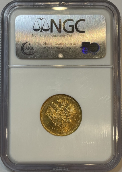 В центре изображен Малый Государственный Герб Российской империи - двуглавый орёл, головы которого увенчаны двумя коронами, третья, большая корона над ними. Все они соединены орденской лентой ордена Св. апостола Андрея Первозванного. На груди орла расположен Московский герб - щит с изображением Георгия Победоносца с копьём поражающего дракона. Вокруг щита цепь ордена Св. апостола Андрея Первозванного. На крыльях изображены гербы: Царства Казанского, Польского, Херсонеса Таврического, Астраханского, Сибирского, Грузинского и герб соединенных княжеств Киевского, Новгородского и Владимирского — по 4 на каждое крыло. В правой лапе орла – скипетр, в левой – держава. Под ним слева направо изображены: номинал - надпись «5 РУБЛЕЙ» и дата выпуска «1889 Г.». По окружности канта имеются рельефные элементы, выполненные в виде зубцов.