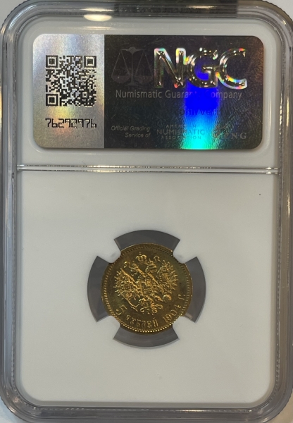 Золотая монета 5 рублей Николай II , 1904 г. АР, в слабе NGC MS 65
