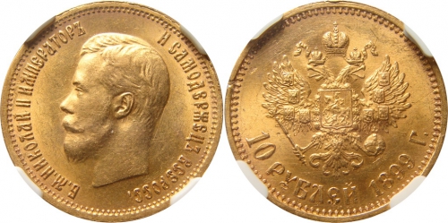 Золотая монета Николая II 10 рублей 1899 год состояние MS 62