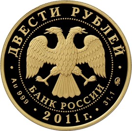 в центре диска - эмблема Банка России (двуглавый орел с опущенными крыльями, под ним - надпись полукругом "БАНК РОССИИ"), обрамленная кругом из точек и надписями по кругу - вверху: "ДВЕСТИ РУБЛЕЙ", внизу: слева - обозначения драгоценного металла и пробы сплава, в центре - дата выпуска "2011 г.", справа - содержание химически чистого металла и товарный знак монетного двора.